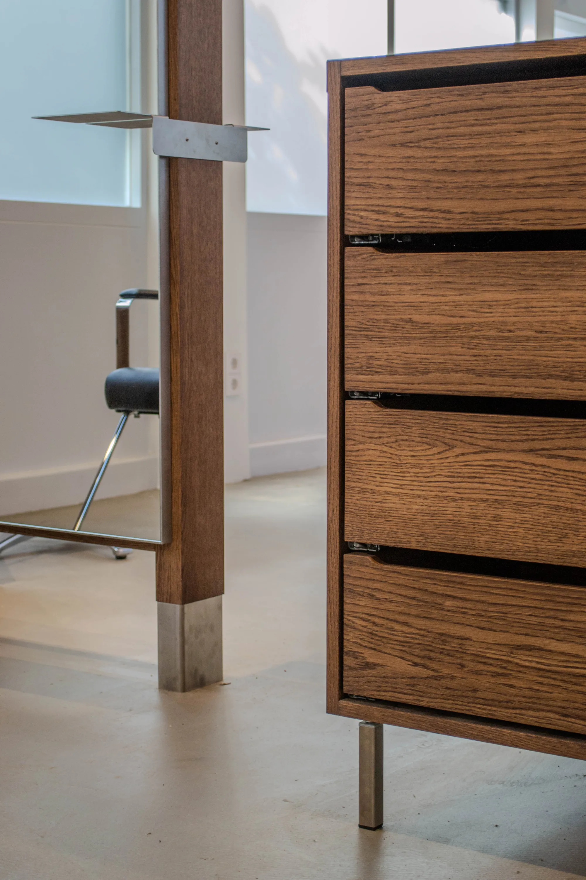 The existing grid of steel beams and large roof lights formed the basis for the spatial layout. This structural rhythm guided the positioning of mirrors and lighting, bringing clarity and balance to the salon. A ceiling clad in oak veneer adds warmth, while custom furniture in dark oak veneer, stainless steel and sage-coloured HPL creates a refined yet robust material palette.