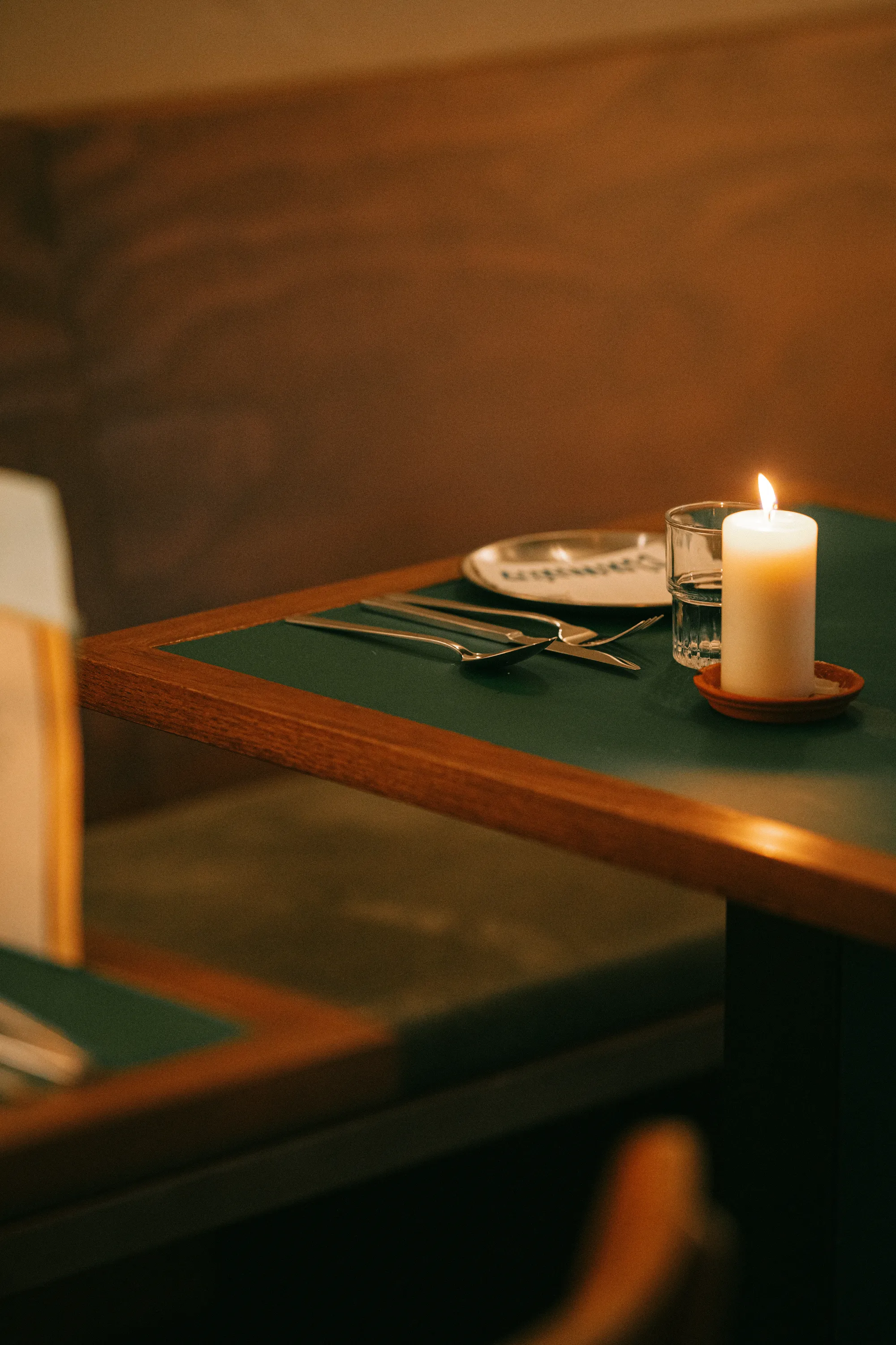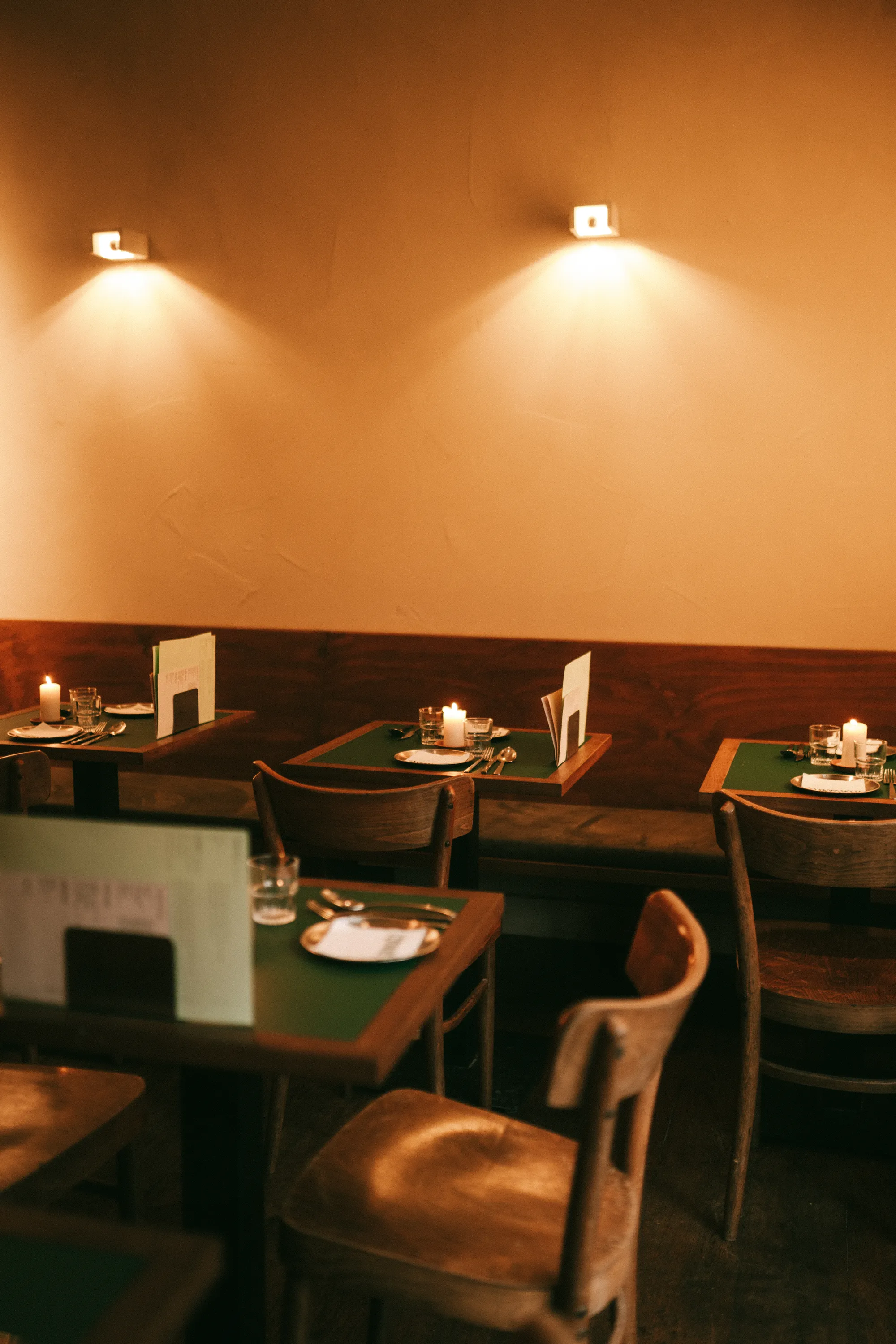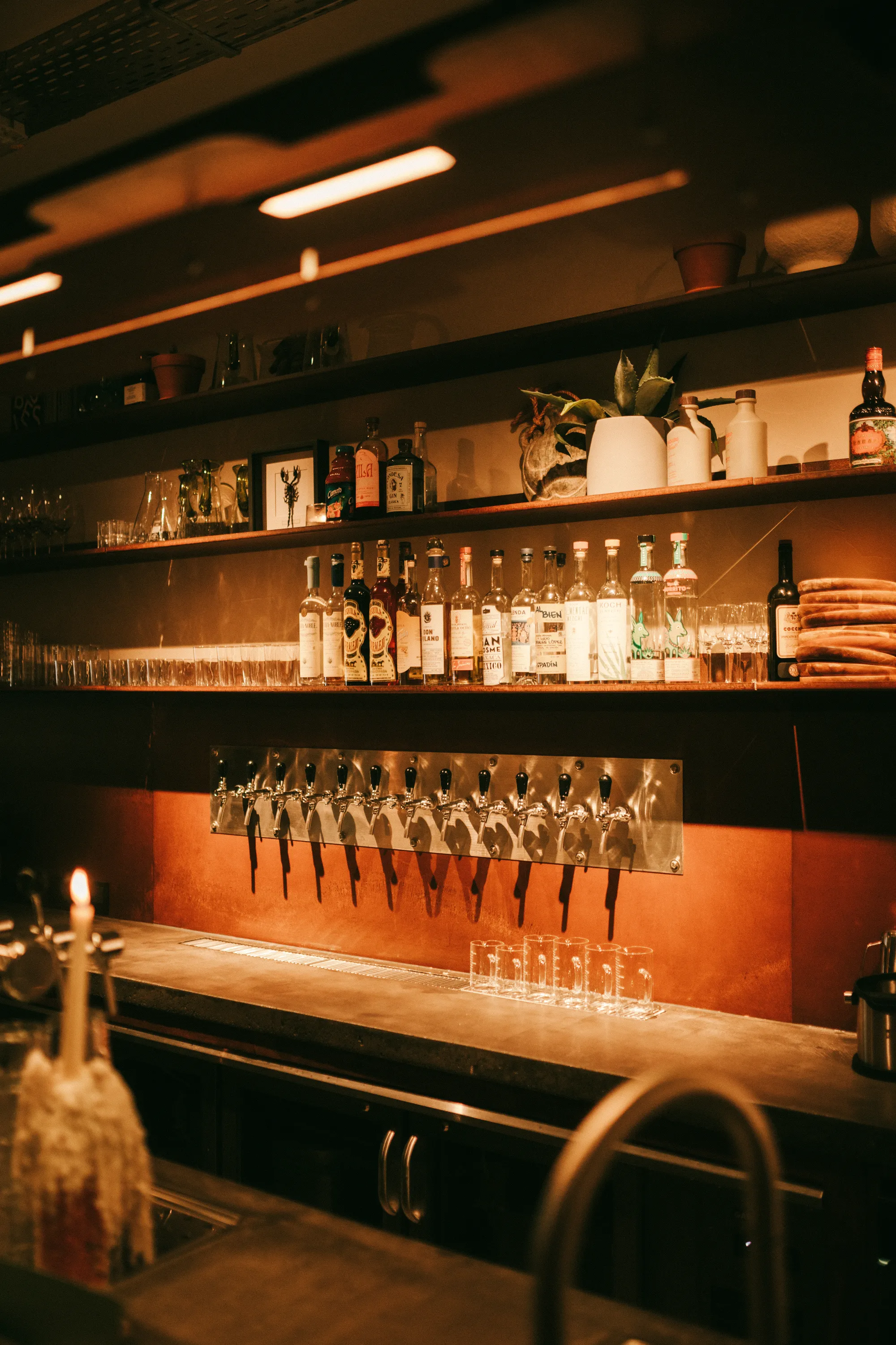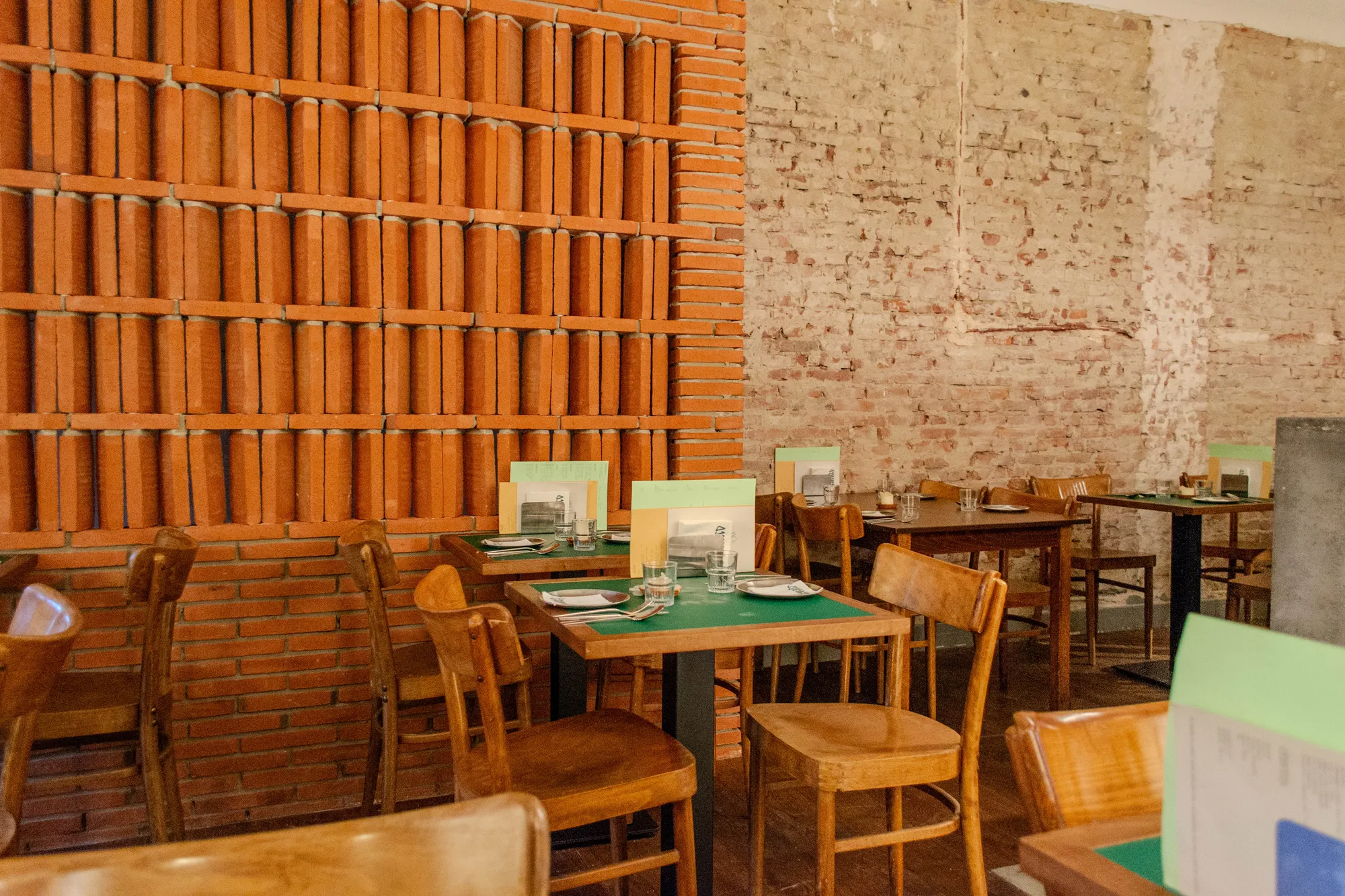 The interior emphasises texture and tactility, using materials such as concrete, oak and pine wood, Corten steel, stainless steel, brick and coloured laminate. Surfaces are intentionally finished to evoke a sense of ageing and honesty. A concrete bar integrates all serving functions, while the Corten steel back bar and lighting elements create a warm, candle-like glow that highlights the material textures throughout the space.